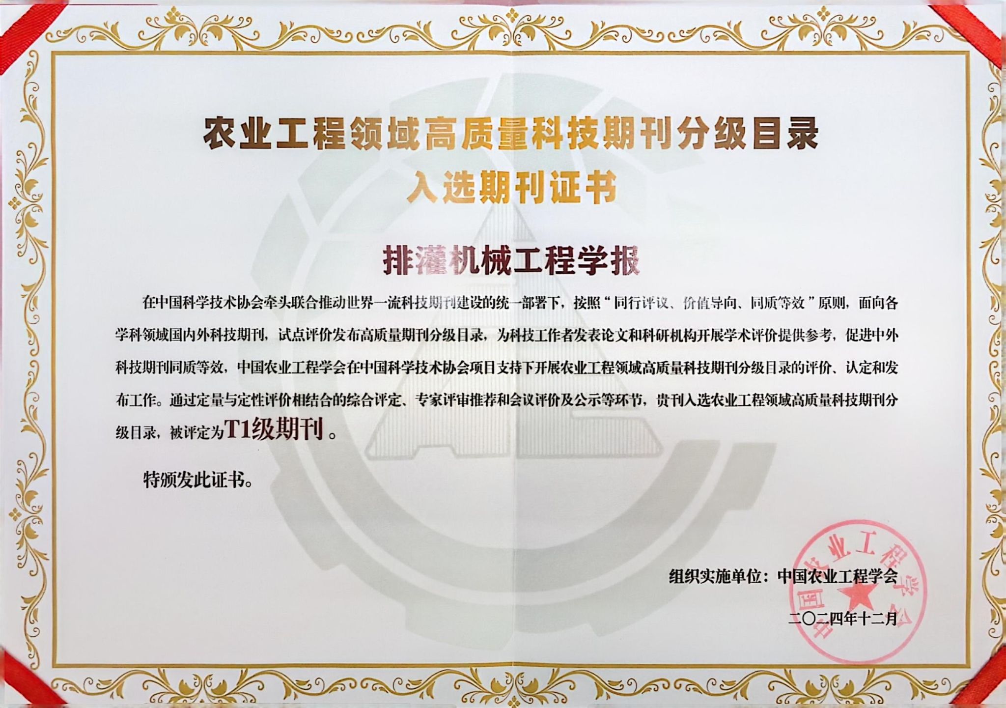 近日,中国农业工程学会在中国农业科学院国家农业图书馆召开发布会,正式发布其编制的“农业工程领域高质量科技期刊分级目录”,我校主办的《排灌机械工程学报》《FH网页登录学报(自然科学版)》双双入选,分别位列T1级和T2级。