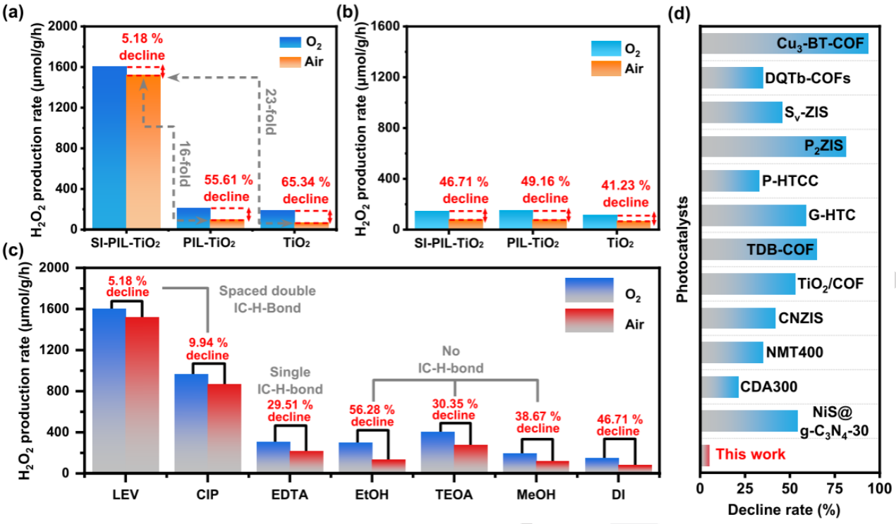 该文通过在咪唑离子液体复合光催化剂(SI-PIL-TiO2)表面构建一种可与电子供体盐酸左氧氟沙星(LEV)结合的隔位双氢键(IC-H-bond),有效促进了催化剂活性位点对氧气的选择性捕获,为在空气条件下高效光合成H2O2提供了有效的策略。
