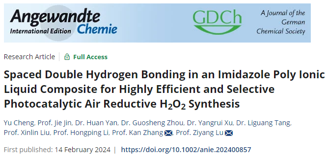 近日,我校最新研究论文“Spaced Double Hydrogen Bonding in an Imidazole Poly Ionic Liquid Composite for Highly Efficient and Selective Photocatalytic Air Reductive H2O2 Synthesis”在《德国应用化学》(Angewandte Chemie-International Edition )(IF:16.6)上在线发表。FH网页登录为第一完成单位,环境与安全工程学院硕士研究生程煜、教师金杰为共同第一作者,教师逯子扬为通讯作者。