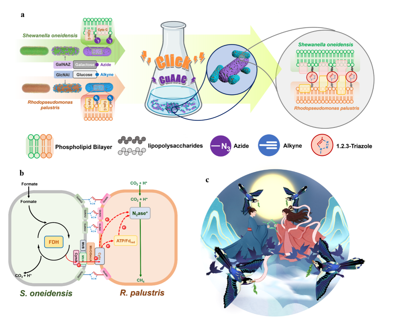 针对以上关键难题,该研究提出了“细胞间距”是决定DIET的关键因素的科学假设和“细胞鹊桥工程”的DIET调控新思想(图1)。据此,课题组以希瓦氏菌(S. oneidensis,SO)和沼泽红单胞菌(R. palustris, RP)为典型模型,设计了活细胞点击化学(Living Cell-Cell Click Chemistry)新策略。该策略为SO菌和RP菌搭建“鹊桥”,使“牛郎”菌(SO)终与“织女”菌(RP)相会,实现了不同种属细胞之间分子尺度的特异性直接链接。