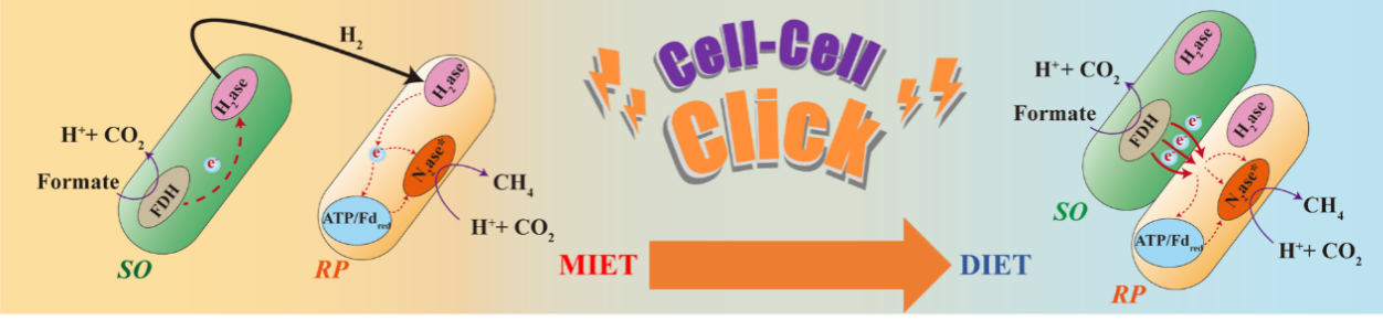 不同种属细菌细胞之间的电子传递过程是近年来国际上新发现的微生物能量代谢过程,直接种间电子转移(DIET)是其中最重要的一种细胞间电子传递模式。DIET对于维持微生物群落功能、驱动地球元素循环和污染物转化至关重要,已成为环境和地学领域研究的国际前沿。但是,DIET如何发生及如何调控一直是困扰这一领域悬而未决的关键基础科学难题。