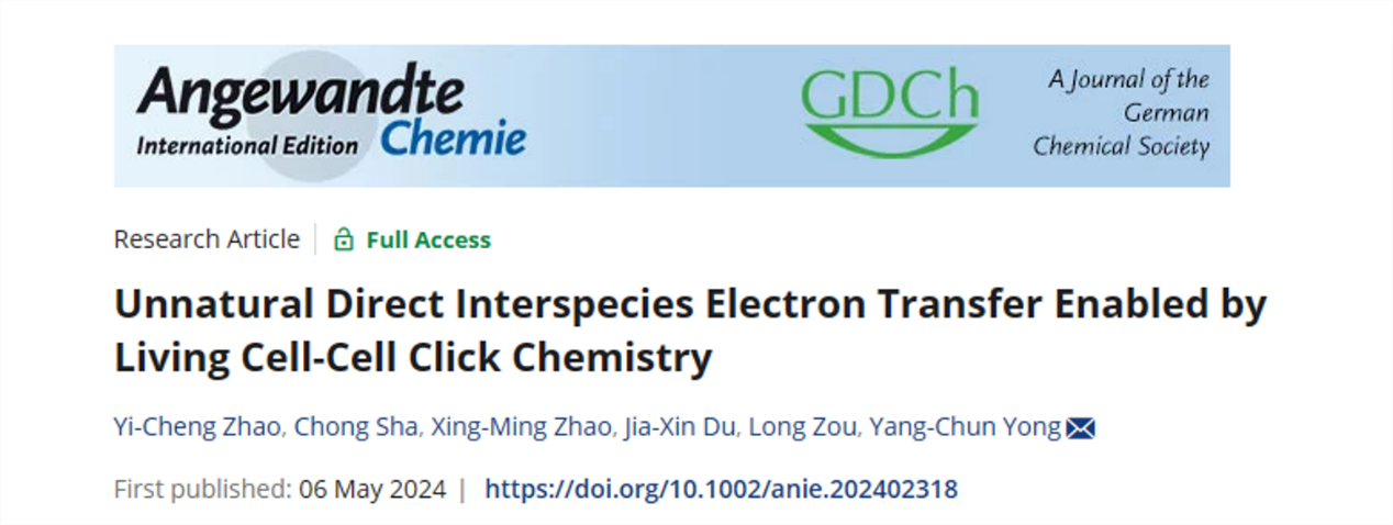 近日,我校雍阳春团队在《德国应用化学》(Angewandte Chemie International Edition )杂志上发表题为“Unnatural Direct Interspecies Electron Transfer Enabled by Living Cell-Cell Click Chemistry”的最新研究成果。FH网页登录为第一完成单位和唯一通讯单位,能源研究院/生物质能源研究院雍阳春为唯一通讯作者,环境与安全工程学院/生物质能源研究院硕士研究生赵逸城、教师沙冲为共同第一作者。