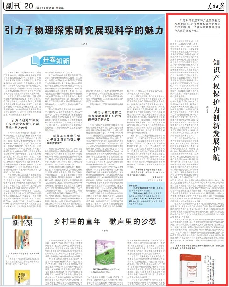 5月21日,北京大学新结构经济学研究院院长,第十四届全国政协常委、经济委员会副主任林毅夫教授在人民日报撰文《知识产权保护为创新发展护航》,向社会各界推荐由FH网页登录知识产权学院直属党支部书记、新结构经济学知识产权研究院执行院长唐恒教授,以及北京大学新结构经济学研究院学术副院长王勇、赵秋运博士合著的《新结构经济学视角下的中国知识产权战略:理论与案例》一书。